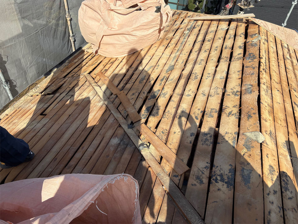今日からは、ゴールデンウイーク過ぎに瓦を捲った現場です。和瓦から洋瓦に葺き替えます。屋根坪が大きかったのもあり2日間での瓦・土メクリでしたが、本当暑かったです…。(-_-;) 今年の夏がとても不安です。