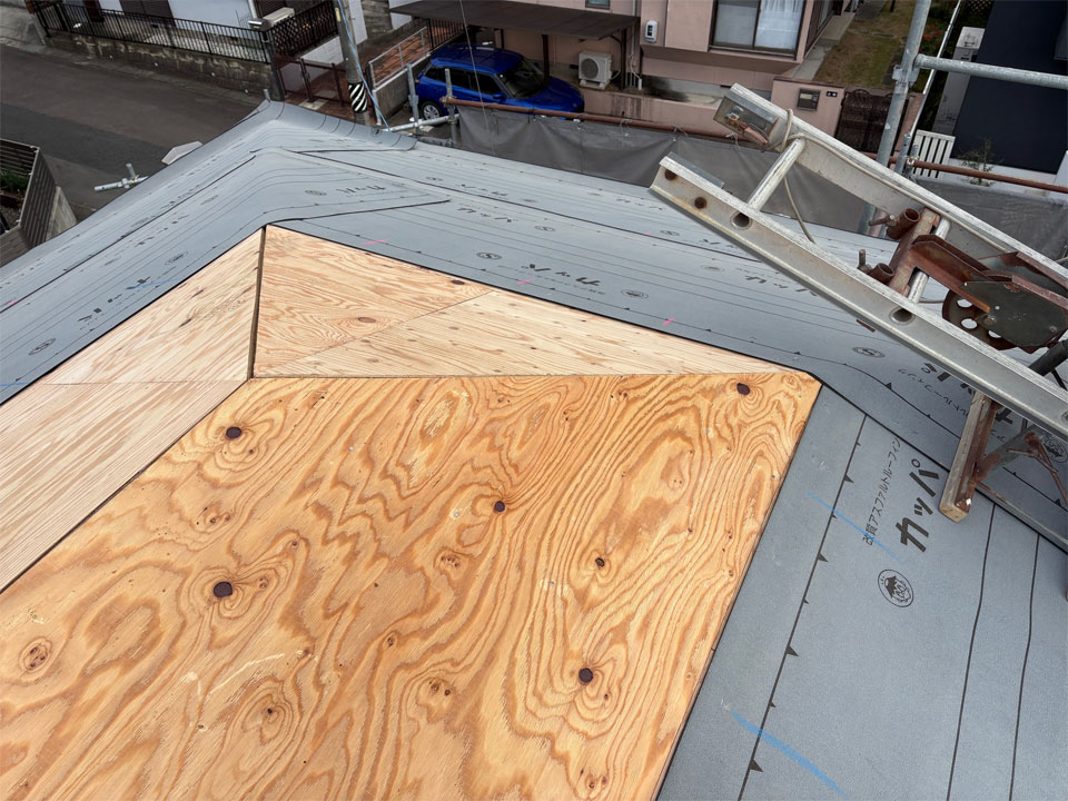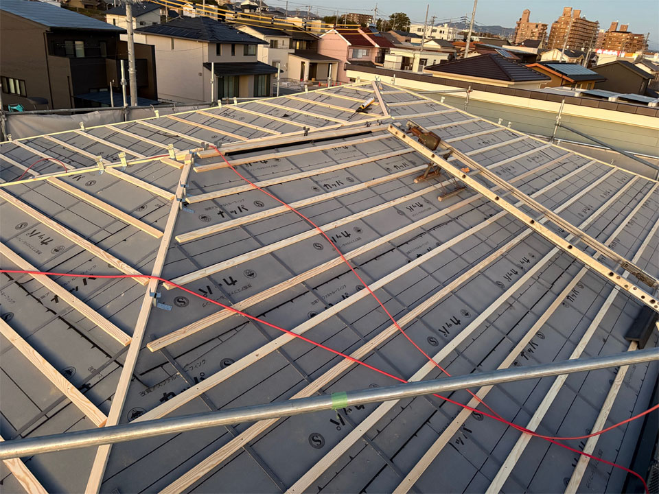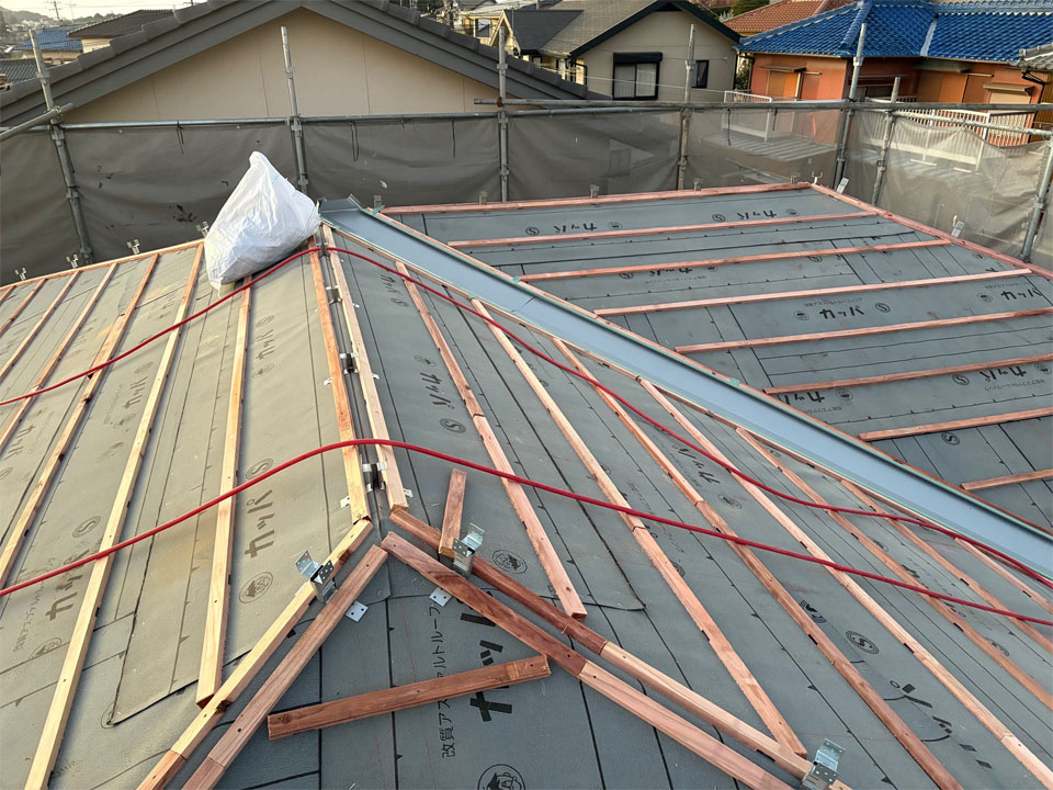 工務店さんの方で屋根下地を直していただき、今日より瓦葺きに入ります。使用瓦はマルスギさんの「イーグルエクサ」です。