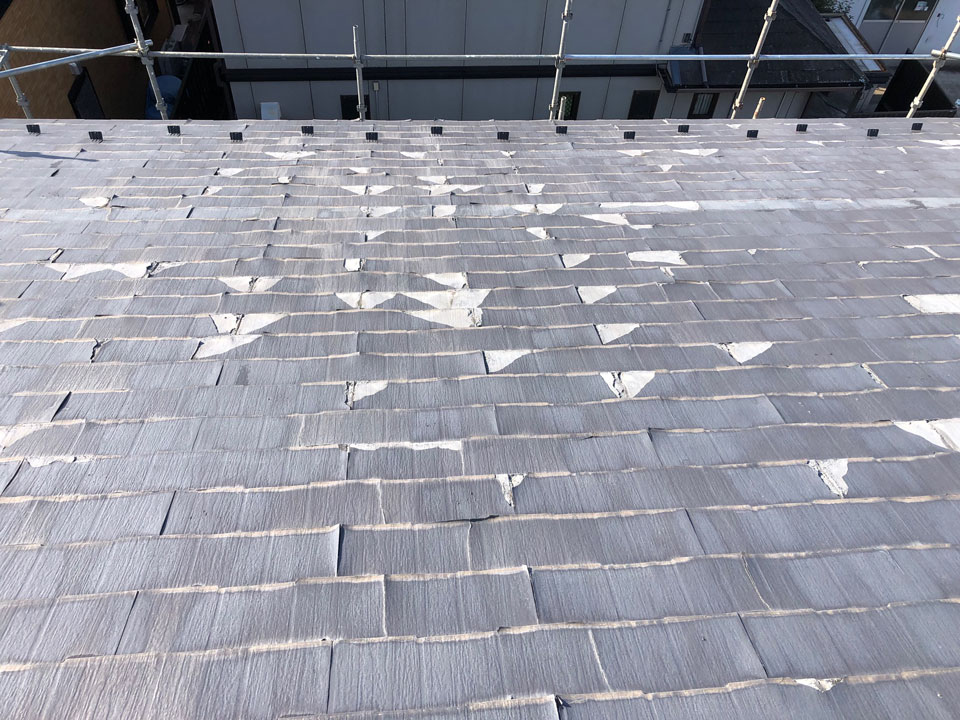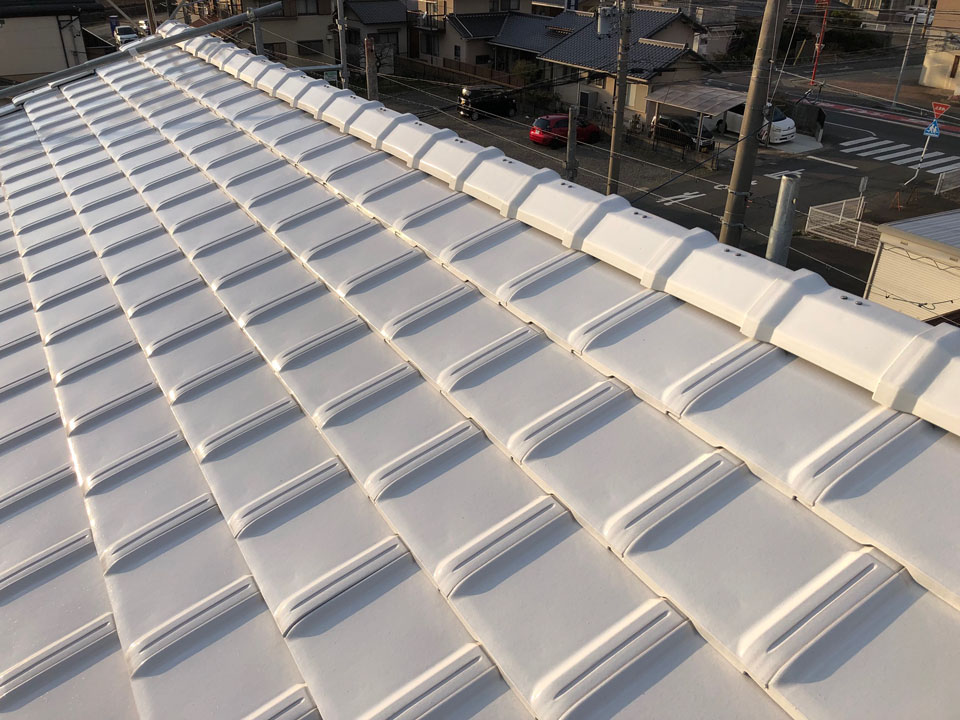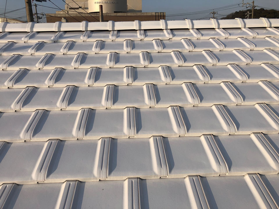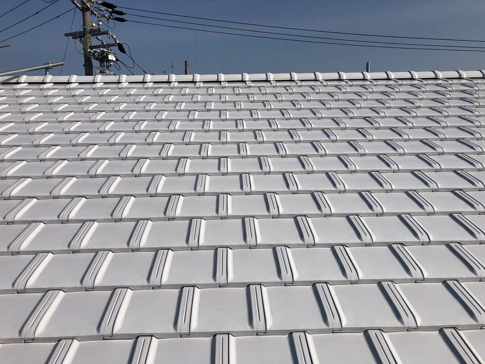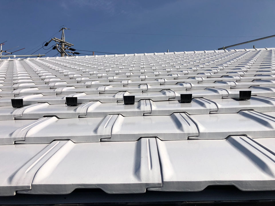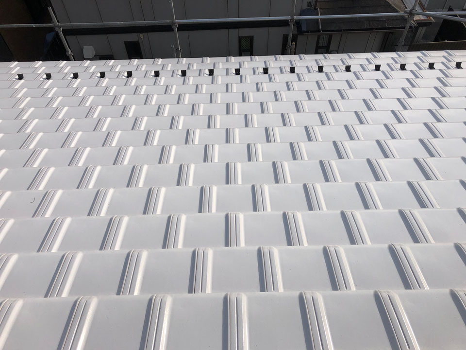 サマースノーは太陽熱反射性能、防汚性能、耐久性能を兼ね備えた特殊な瓦になります。サマースノーは数年前にイエローで葺き替えたことがありますが、今回は白(ホワイト)です。現在は白しかないんですよね…。